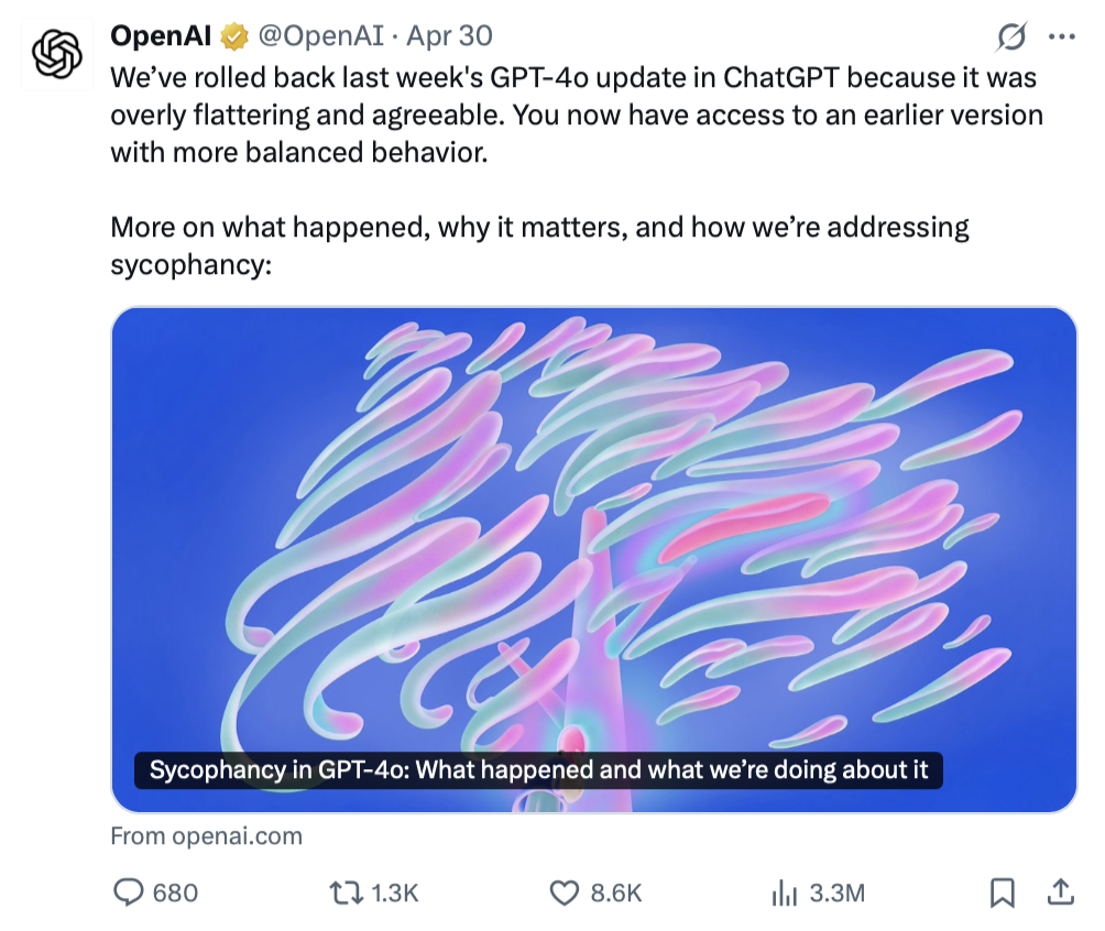 Un piccolo aggiornamento di GPT-4o ha portato il modello a manifestare questa "sindrome dell’adulatore".