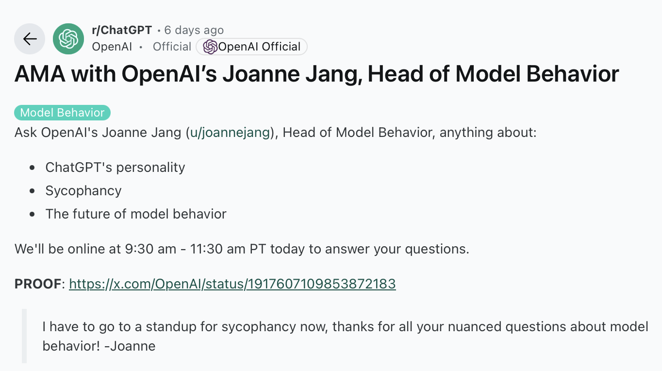 Intanto, vediamo che anche laboratori avanzati come OpenAI stanno ancora cercando di capire come rendere stabile il comportamento dei modelli.