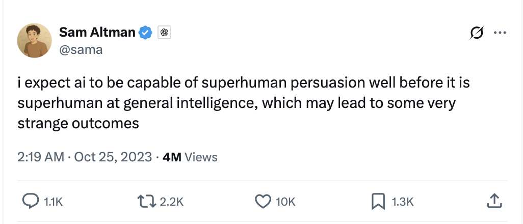 Sam Altman aveva sollevato la questione tempo fa, dicendo che gli strumenti AI sono estremamente efficaci nel far cambiare idea alle persone.