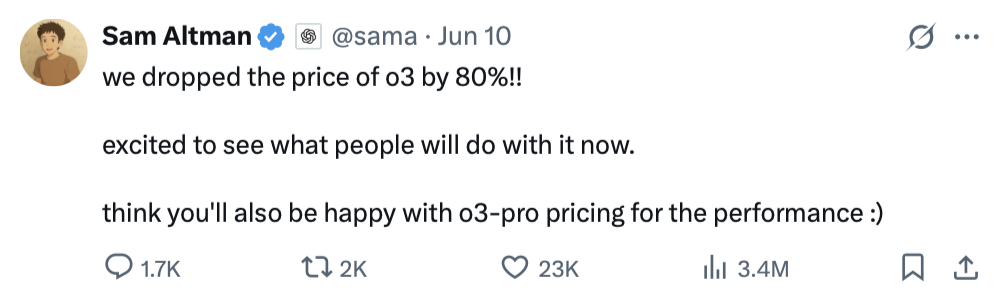 Forse il fattore che più ha sorpreso è che col rilascio di o3-pro, OpenAI ha deciso di abbassare i costi di o3 dell’80%. 🤯
