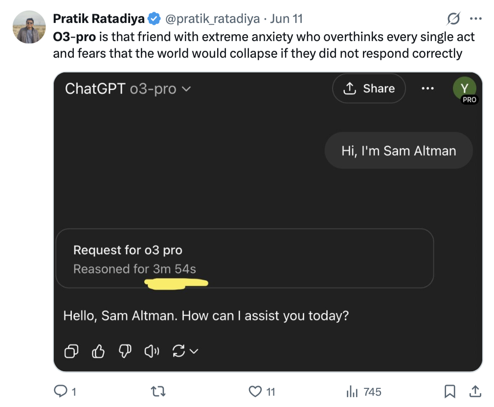 Se devi *risolvere un problema non particolarmente complesso non ha senso che usi o3-pro e aspetti 10 minuti (ipotizzo*) quando con o3 o 4o ottieni un’output che ha circa la stessa qualità.