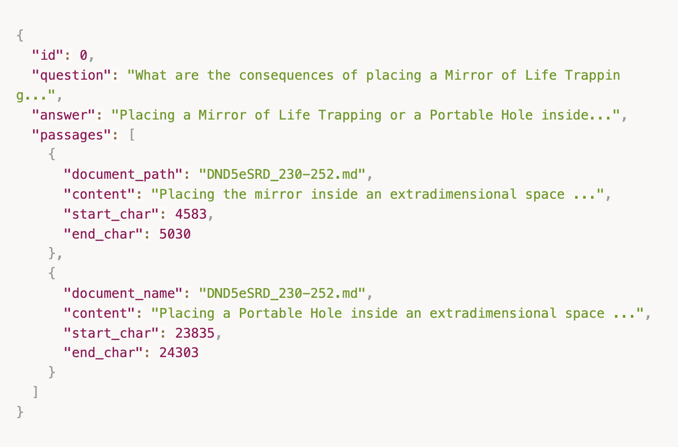 Using this framework, we built a public dataset based on D&D SRD 5.2.1, which covers a subset of fifth edition D&D content (Player's Handbook, DM Guide, Monster Manual). The SRD is released under Creative Commons, so we can make it public. The dataset follows the structure above, is chunk-agnostic thanks to char-based annotations, and includes both easy and medium questions.