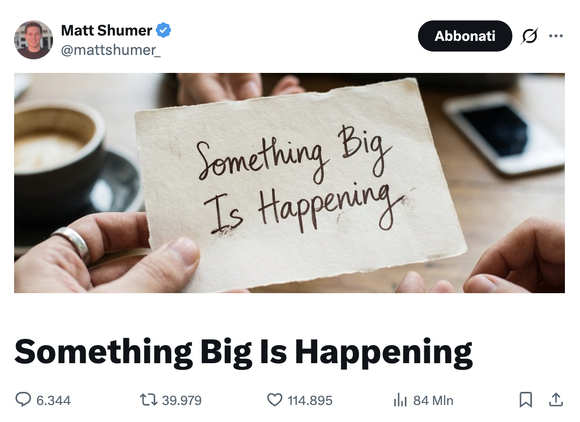 In un post su X che ha fatto 60 milioni di visualizzazioni in pochi giorni, Matt Shumer, fondatore di HyperWrite, sostiene che l'AI ha già cambiato il lavoro di chi la costruisce, e sta per fare lo stesso con tutti gli altri.